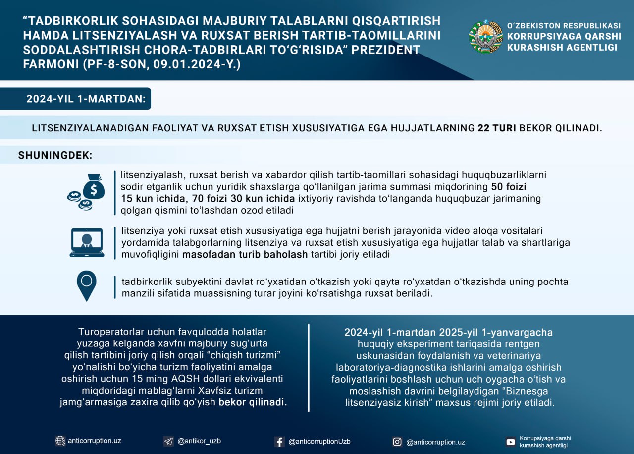 2024 yil 1 martdan litsenziyalanadigan faoliyat va ruxsat etish xususiyatiga ega hujjatlarning 22 turi bekor qilinadi
