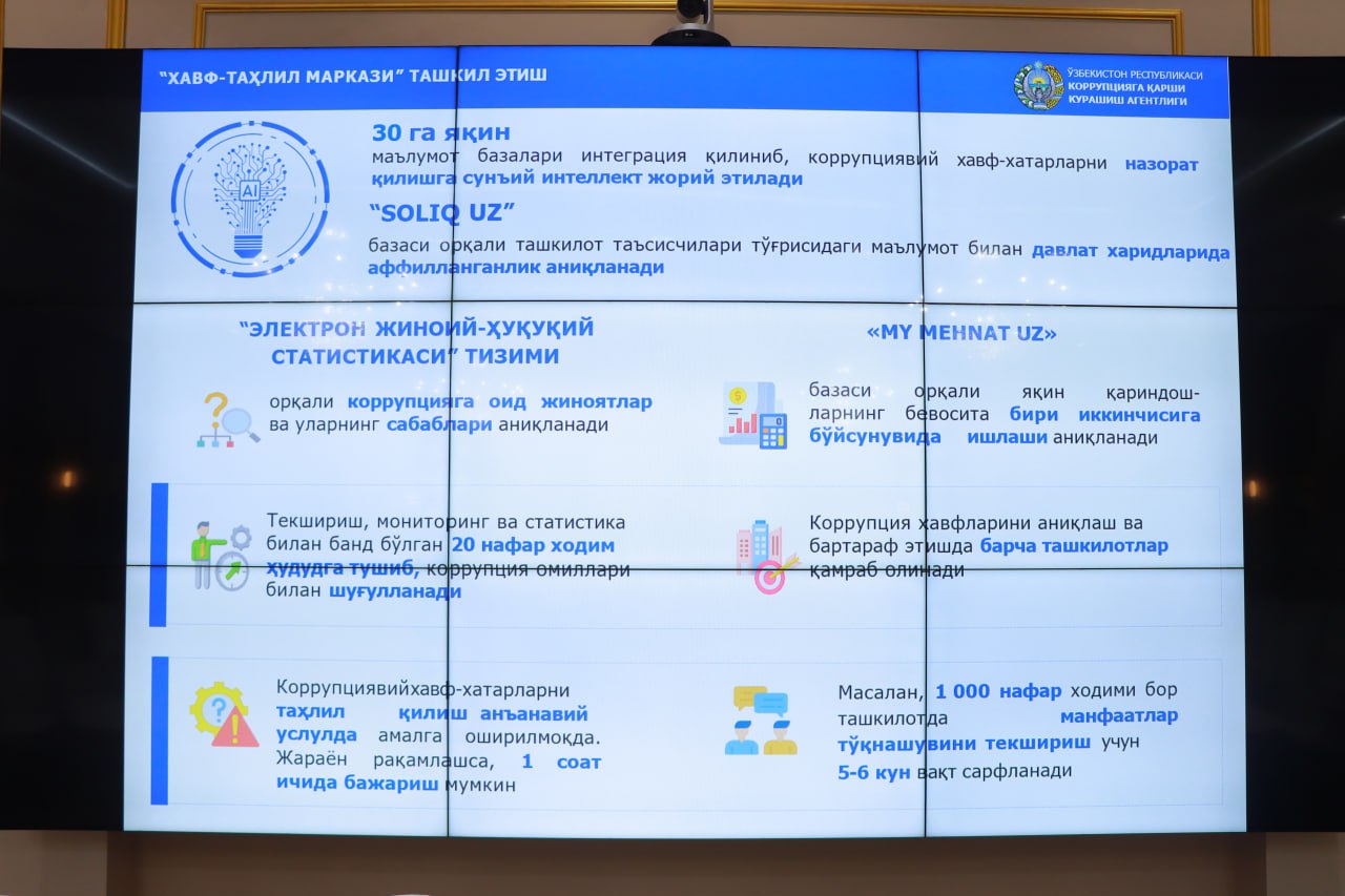 Bundan tashqari, Agentlik huzurida tashkil etilayotgan “Xavf-tahlil markazi” haqida maʼlumot berildi. Markazga vazirlik va idoralarning 30 ga yaqin maʼlumot bazalari integratsiya qilinib, korrupsiyaviy xavf-xatarlarni nazorat qilishga sunʼiy intellekt joriy etiladi. Masalan, soliq.uz bazasi orqali tashkilot taʼsischilari to‘g‘risidagi maʼlumot bilan davlat xaridlarida affillanganlik, “Elektron jinoiy-huquqiy statistikasi” tizimi orqali korrupsiyaga oid jinoyatlar va ularning sabablari, “my.mehnat.uz” bazasi orqali yaqin qarindoshlarning bevosita biri ikkinchisiga bo‘ysunuvida ishlashi aniqlanadi.
