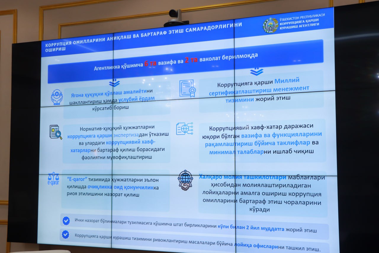 Agentlikka korrupsiyaga qarshi kurashish sohasida preventiv mexanizmlarni joriy etishga qaratilgan bir qator qo‘shimcha vazifalar yuklatildi.