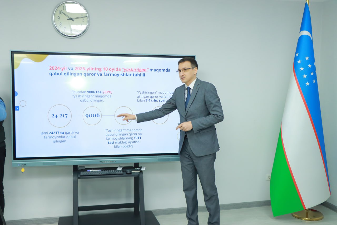 Taʼkidlash joizki, “E-qaror” tizimiga 2021-2025 yillarda 24 417 ta hujjat kiritilgan bo‘lib, ularning 9 006 tasi (37 %) “yashirilgan”, shundan 1911 tasi (21 %) esa mablag‘ ajratish bilan bog‘liq. Shu bilan birga, respublika va mahalliy ijroiya hokimiyati organlari tomonidan qabul qilingan hujjatlarni “E-qaror” elektron tizimida asossiz ravishda eʼlon qilmaslik - davlat hokimiyati va boshqaruv organlari faoliyatining ochiqligi to‘g‘risidagi qonunchilikni buzish deb hisoblanishi hamda tegishli javobgarlikka tortishga asos bo‘lishi qayd etilmoqda.