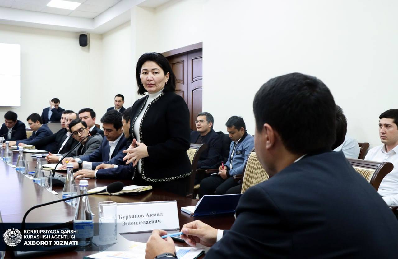 Директор Агентства подробно рассказал об основных направлениях государственной политики по борьбе с коррупцией в нашей стране, сферах с повышенными коррупционными рисками, внедрении системы внутреннего антикоррупционного контроля в органах государственного и хозяйственного управления, а также проводимой работе по предупреждению коррупции в сфере государственных закупок.