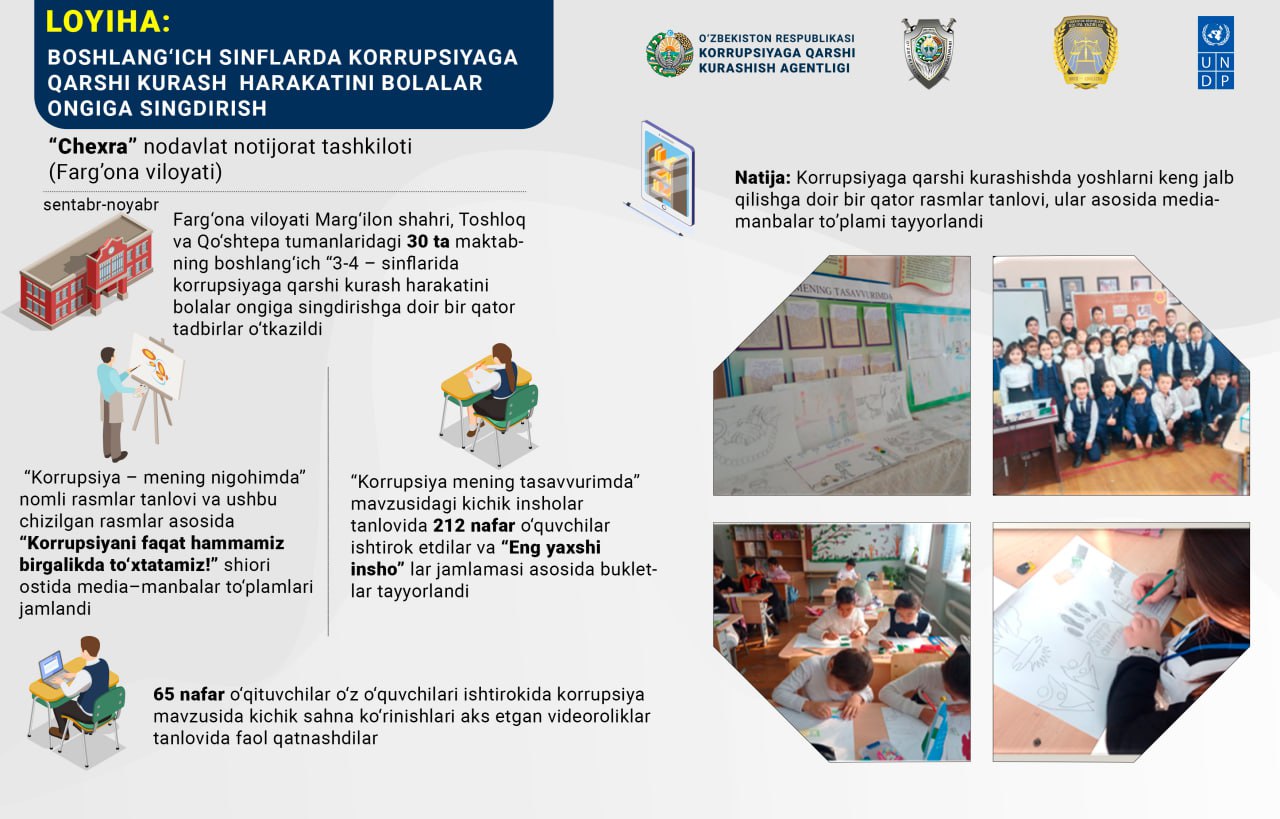 Проведённая работа: в 3-4х классах 30 начальных школ Ташлакского и Коштепинского районов города Маргилан, Ферганской области, проведёны мероприятия, направленные на формирование антикоррупционного мировоззрения у учащихся: