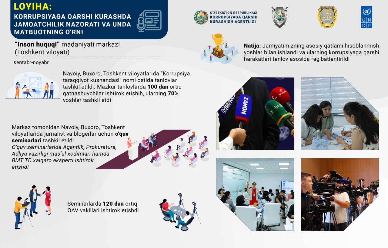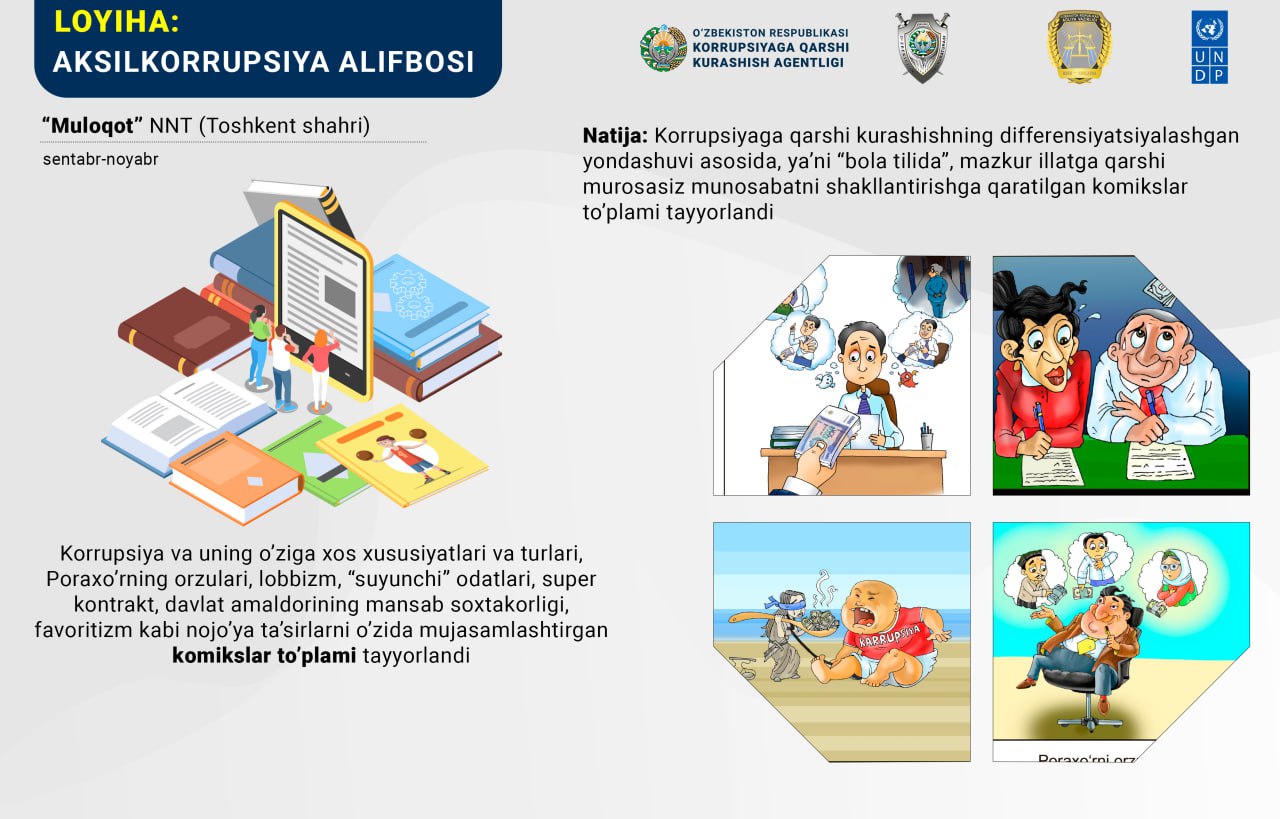 Летом прошлого года Агентством по противодействию коррупции совместно с ПРООН, Генеральной прокуратурой и Министерством юстиции Республики Узбекистан был проведён Совместный конкурс среди институтов гражданского общества и средств массовой информации в области предупреждении и противодействии коррупции на тему «Вовлечение институтов гражданского общества в процесс разработки и внедрения инноваций в противодействие и предупреждение коррупции». Победителями конкурса были реализовали проекты на выделенные им гранты.