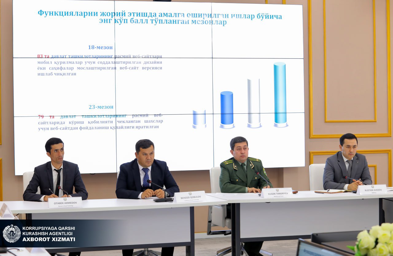 For reference: the Commission for Assessing the Effectiveness and Productivity of Ongoing Work in Ensuring Openness (the Assessment Commission) is a collegiate body that makes the final decision on the calculation of the Openness Index, and consists of highly qualified specialists and experts from the Anti-Corruption Agency, the Agency for Information and Mass Communications under the Administration of the President of the Republic of Uzbekistan, the State Inspectorate for Control in the Sphere of Informatization and Telecommunications, the Ministry of Economy and Finance, the Statistics Agency under the President of the Republic of Uzbekistan, the Legislative Chamber and the Senate of the Oliy Majlis, as well as representatives of NGOs.