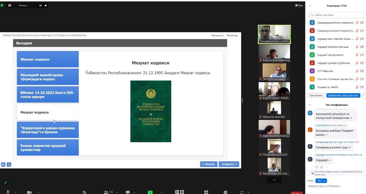 Tadbir davomida korrupsiyaga oid huquqbuzarlik uchun javobgarlikning huquqiy asoslari, turlari, jazoni taʼminlash jarayonidagi bir qator muammolar haqida so‘z bordi.