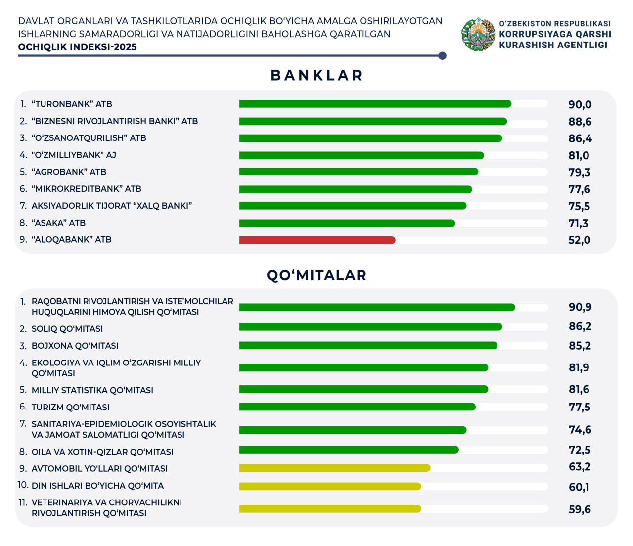 Республика даражасидаги ташкилотлардан - Ўрмон ва яшил ҳудудларни кўпайтириш, чўлланишга қарши курашиш агентлиги ва “Ўзбекистон темир йўллари” АЖ, ҳудудий миқёсда эса Андижон вилояти ва Тошкент шаҳар ҳокимликлари энг паст кўрсаткичларни қайд этиб, “қизил” тоифада баҳоланди.