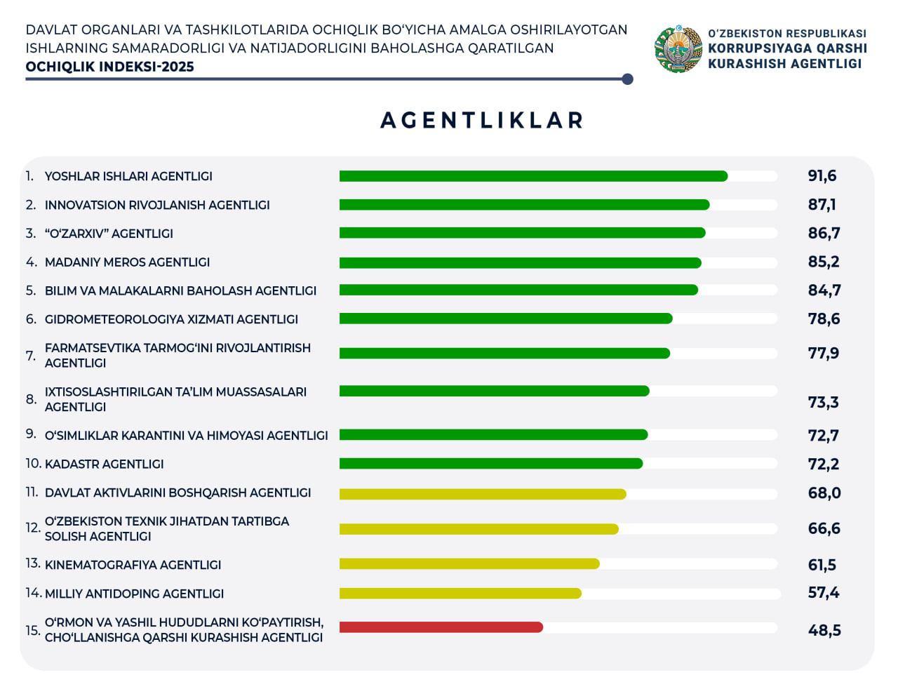 Якуний натижаларга кўра, 66та давлат органи “яшил”, 22таси “сариқ” ва 9таси “қизил” самарадорлик кўрсаткичларини қайд этди.