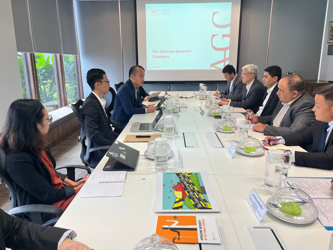 Ташрифнинг биринчи куни Сингапурнинг Коррупция амалиётларини тергов қилиш бюроси ва Бош прокуратура вакиллари билан учрашув ташкил этилиб, коррупцияга қарши курашиш соҳасида давлат сиёсатини шакллантириш ва уни амалга ошириш, бу борада аксилкоррупция бюроси ва прокуратура органларининг роли, давлат органлари фаолиятининг очиқлиги ва ҳисобдорлигини таъминлаш, шунингдек, давлат хизматчилари салоҳиятини ошириш тизими каби қатор муҳим масалаларда музокаралар ўтказилди.